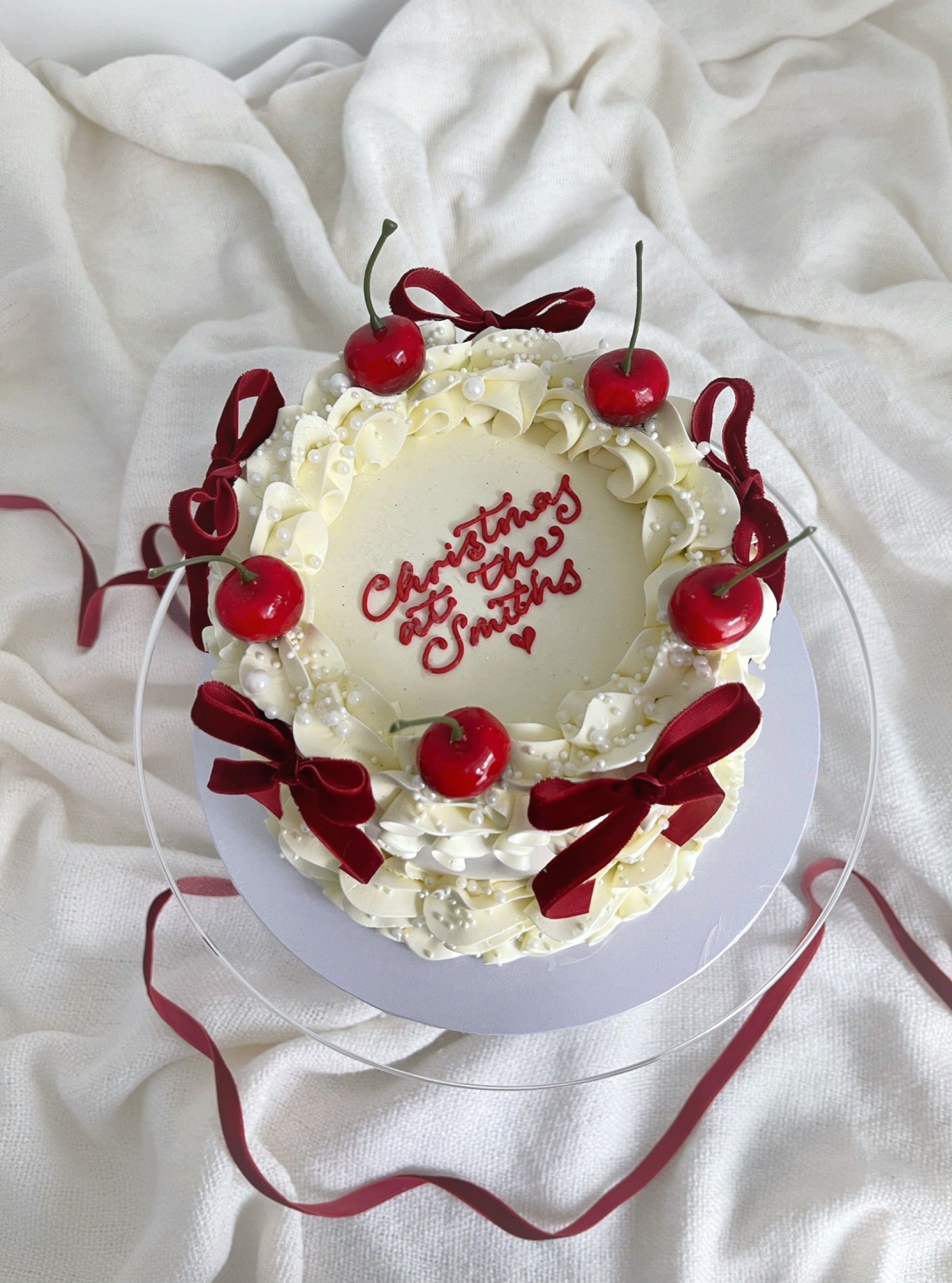 A classic frilly style cake decorated with velvet ribbons and cherries.
