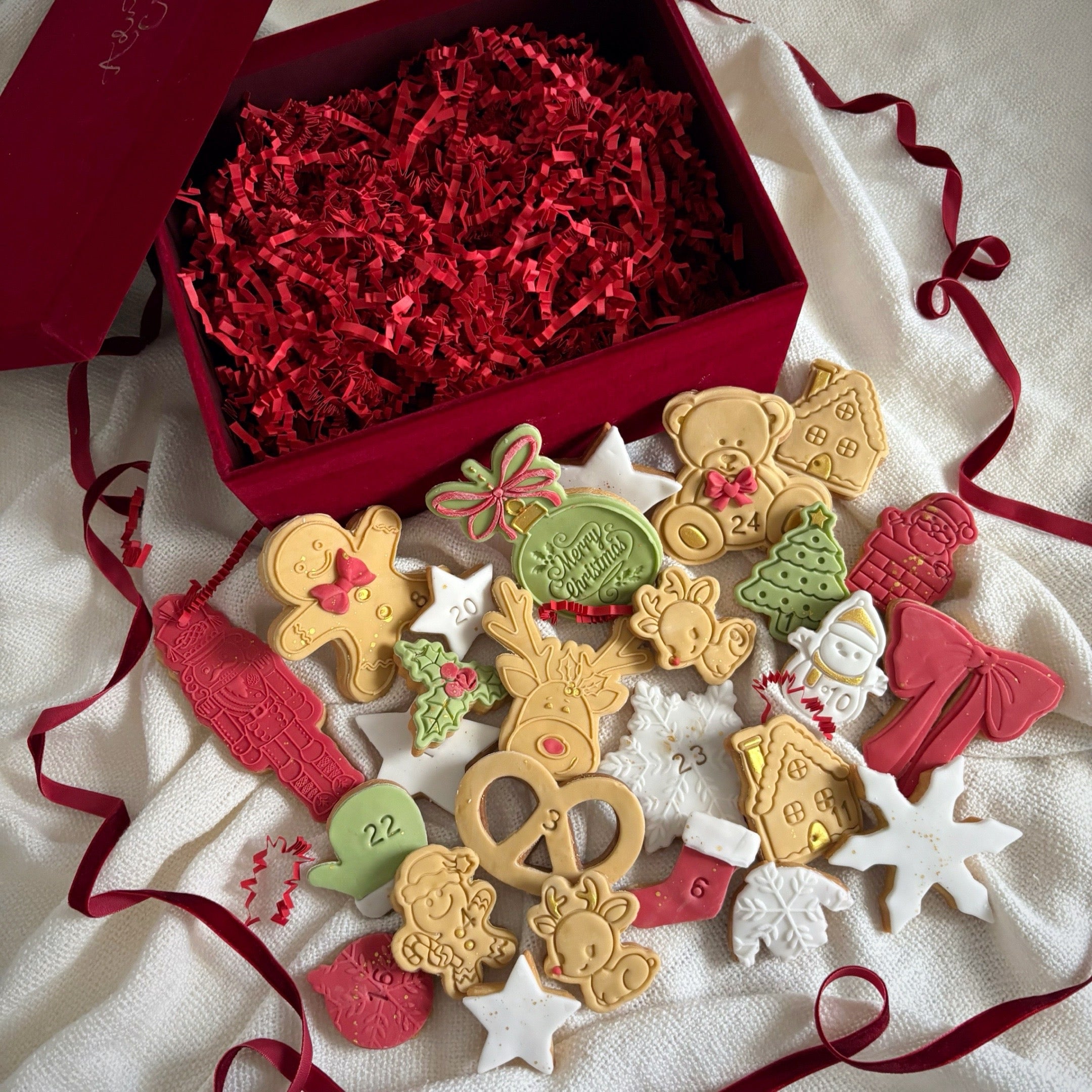Make this year's countdown to Christmas extra special with this set of 25 advent cookies in a mix of sizes and designs, packaged with a red velvet gift box tied with a velvet ribbon and the option to add personalised calligraphy ♥️