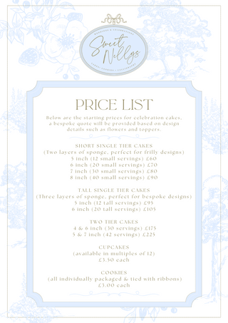 If you would like a bespoke design which isn’t listed on here, please fill out an enquiry form and I will get back to you to confirm my availability and discuss designs and prices.